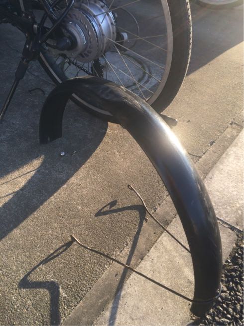後輪を見たら予想通り泥除けの留め具が切れ、後輪の下まで入り込んだ状態になっていました。