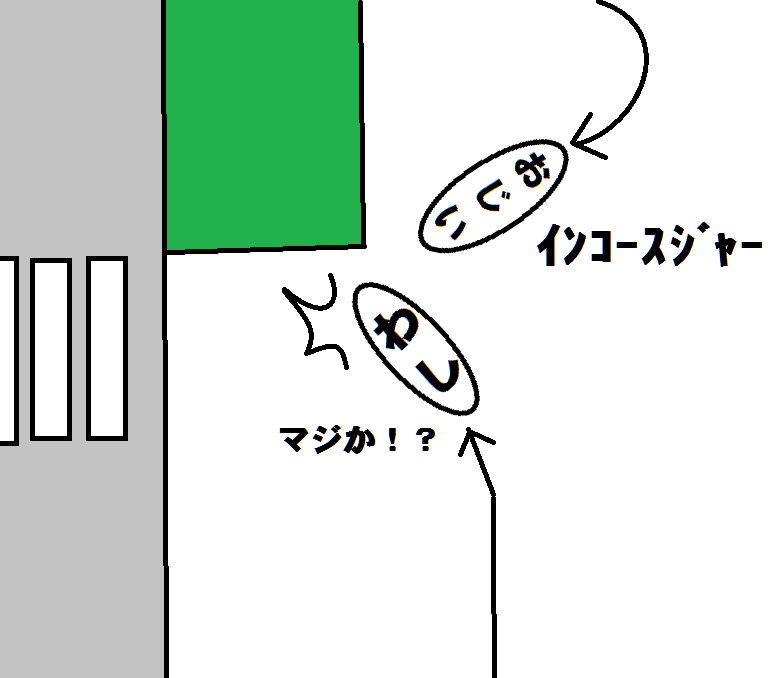 左の道路の信号機がチカチカしだしたから、向かいからくる奴が阿呆なら無理矢理曲がってくるかもしれないなー位には思ってましたが、まさか本当にこんな狭いとこ攻めてくるとは思いませんでしたね。