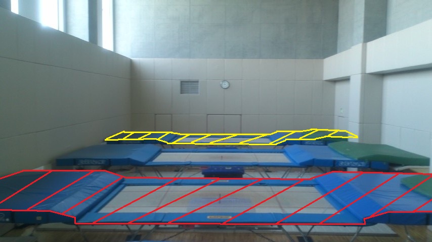 トランポリンバドミントンでは、2台のトランポリンを使う。