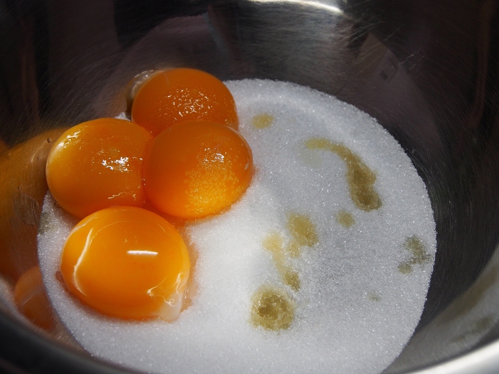 1.卵黄・砂糖・塩・バニラエッセンスをボールで混ぜる